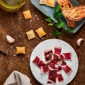This mini Serrano ham undergoes a slow curing process of at least 9 months, allowing the flavours to mature gently and develop the characteristic smooth, savoury taste of premium Serrano ham.